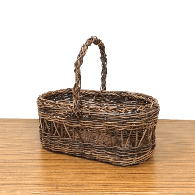 高さ:9cm(全体-20cm) 幅:23cm 奥行き:13cm 重さ:120g ※「内寸」は表記サイズから約2cm引いた値となります。 ※高さのサイズに持ち手の高さは含まれていません。 一点商品|矢来編み・小判底・一本手のあけび-ミニバスケットです。 菓子器や小物入れ、鉢カバーとしてもお使いいただけるあけび蔓細工のミニバスケットです。 黒っぽいあけび蔓を多用し仕上げた、小ぶりでかわいらしいシルエットが特徴の品です。 一本手(取手)とかごのバランスが良く、サイズが小ぶりなため、お部屋のいろいろな場所でご使用いただけます。 矢来の透かし模様がかご全体に編み込んであり、単にデザインとしてだけでなく、かごの強度を高めています。 材料不足の影響もあり、色ムラの強い仕上がりとなっているため、お買い求めいただきやすい価格になっておりますので、ぜひこの機会にご注文ください。