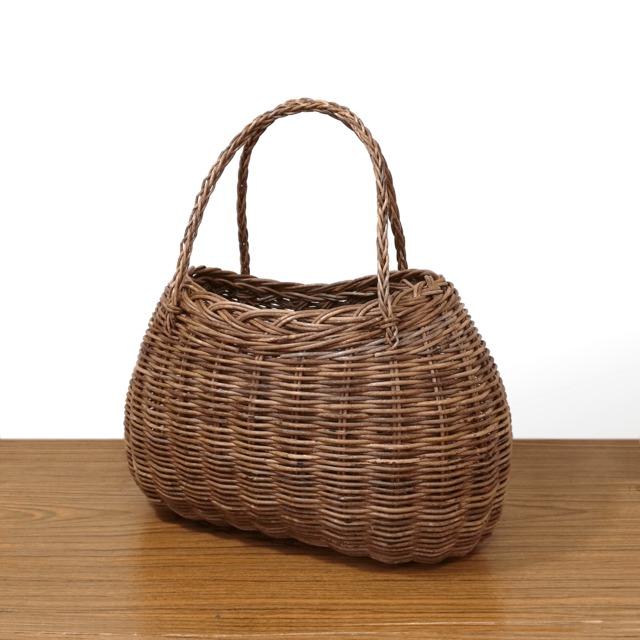 高さ:22cm 側-24cm 幅:口-23cm 最大-35cm 奥行:15cm 重さ:500g ※「内寸」は表記サイズから約2cm引いた値となります。 ※高さのサイズに持ち手の高さは含まれていません。 割引商品|並編み(中サイズ・胴張り)のあけび-かごバッグです。 太目のあけび蔓を多用した、完全フリーハンドで仕上げた並編みのかごバッグです。 シンプルな並編みで制作しているため、かごの外側も内側もすべすべとしていて、とても使いやすいかごバッグです。 また、太いあけび蔓を贅沢に編み込んでいるため、大変丈夫でしっかりとした仕上がりになっています。 ※かごの口の内寸は、幅:約20cm・マチ:約12cmです。 フリーハンド仕上げの自然な形が味わい深く、中型サイズの実用的なあけびバッグです。 持ち手に使用した材料が普段よりも少し細目だったこと、かごの口部分の表側と裏側で形のずれ(商品画像2枚目を参照)があるため、お安く販売しております。