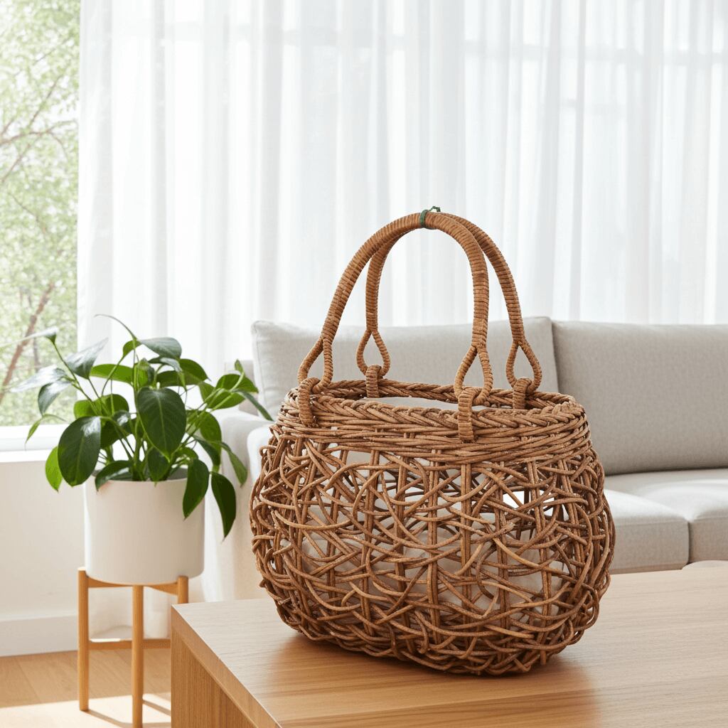 丸みのある柔らかなシルエットと丁寧に通したあけび蔓が相性良く引き立て合い、かわいらしくも実用的なかごバッグに仕上がっています。