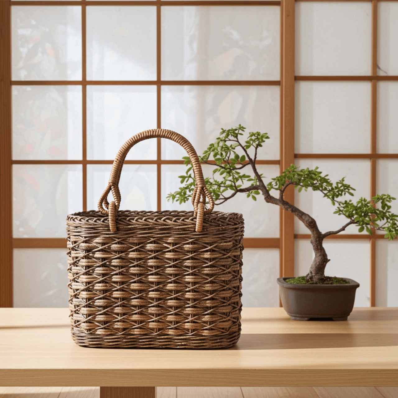 黒っぽいあけび蔓を多用し制作した、仕上がりの良い、たすき編みのかごバッグです。