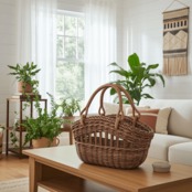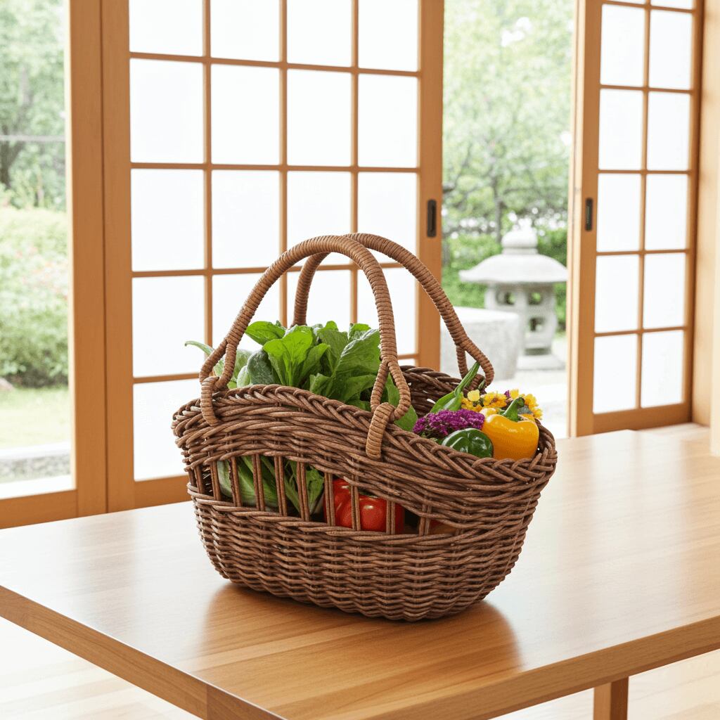 かごのサイズの割に太目のあけび蔓を使用したため、少し重量感がありますが、材料の質が良く、丁寧に編み込んでいますので、とても感じの良い仕上がりになっています。