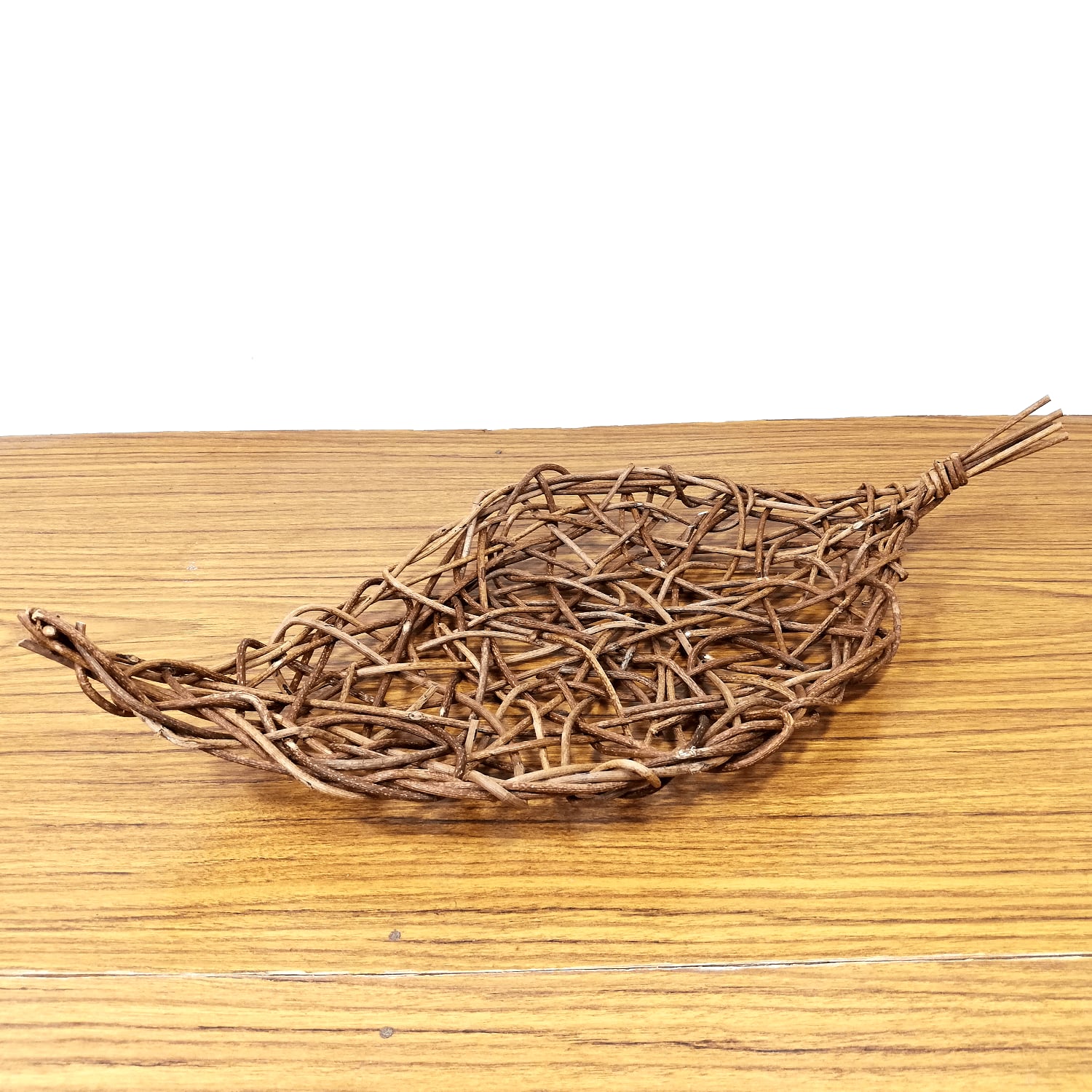 葉っぱ型に制作した型紙に沿って、あけび蔓を乱れ編みで通しながら形をつくり、少し深さを付けました。