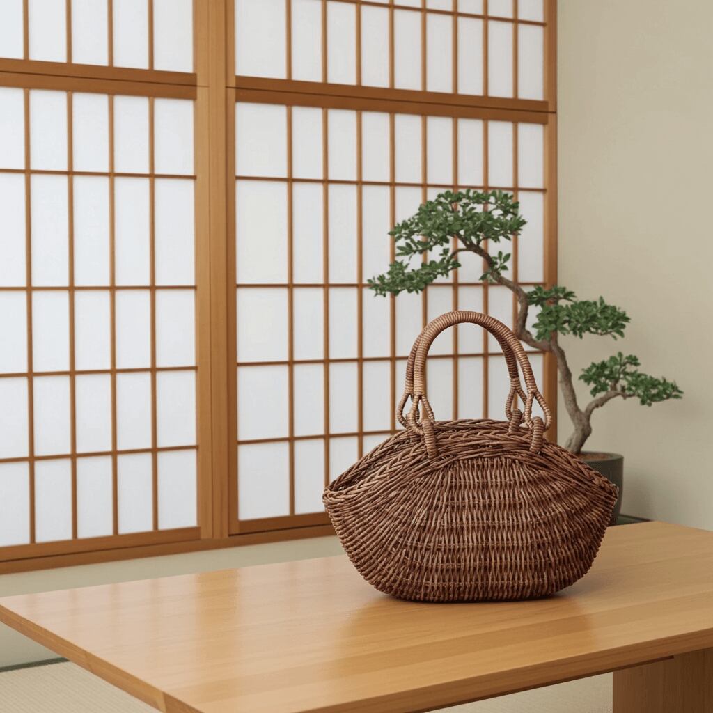 「並編み」と呼ばれる製法なので、編地の凹凸が緩やかなためとても使い心地が良く、当店ではグニ手(根付された持ち手)ではなく開閉可能な持ち手を付けているため、グニ手の物に比べ、物の出し入れがよりスムーズです。