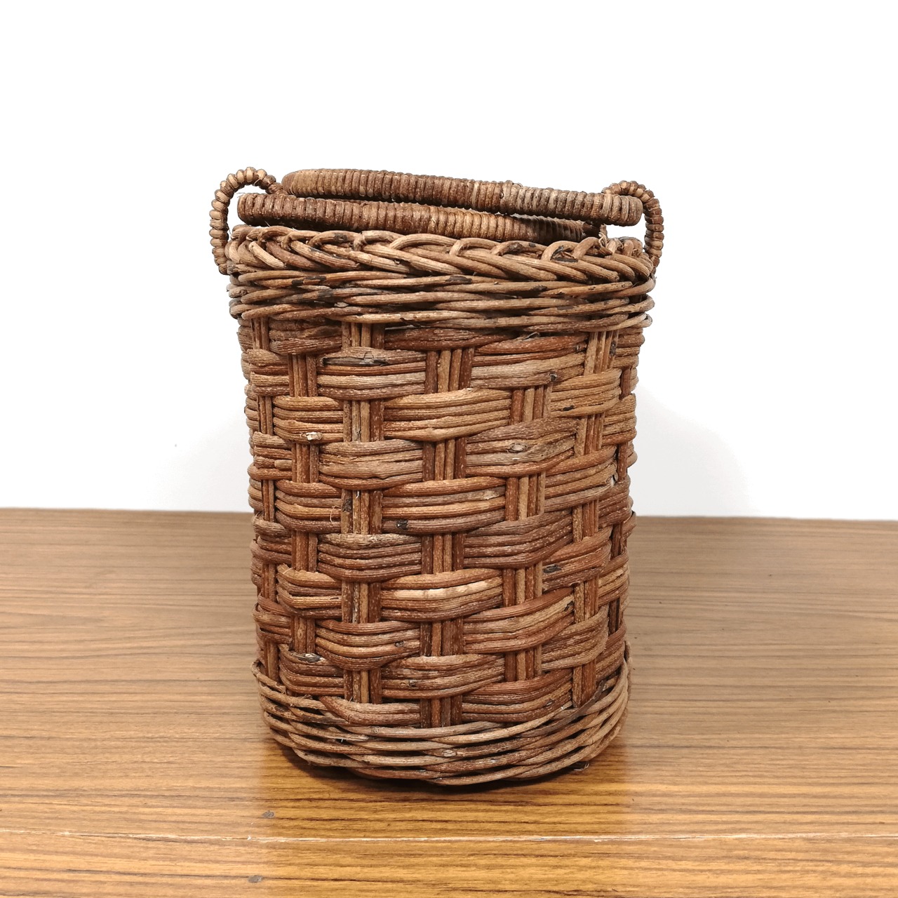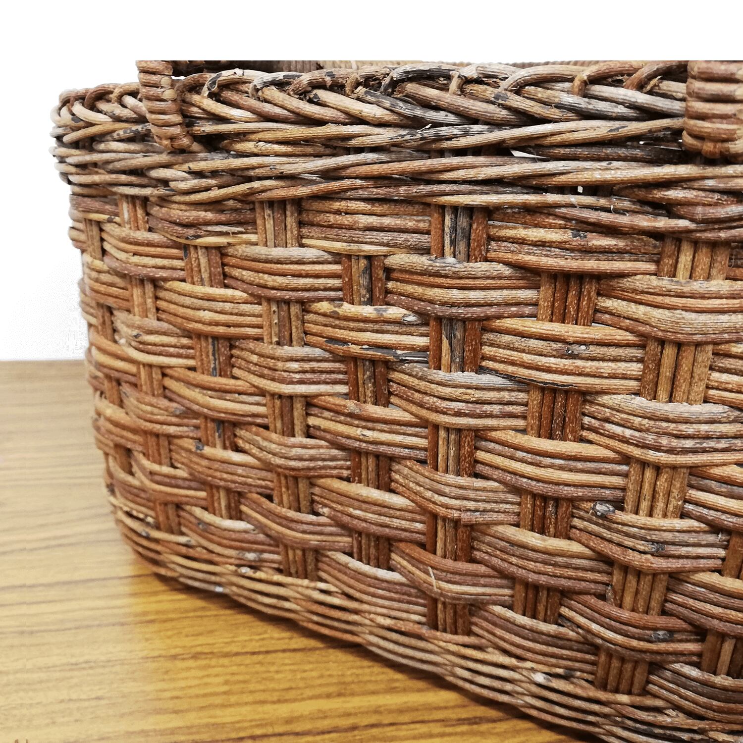 かごの側面に顕著な歪みがあり、底面の編地の編み具合が甘く、穴のような隙間が生まれているため、今回は割引での販売となっております。また、床に置いた際に少しガタツキがあります。