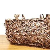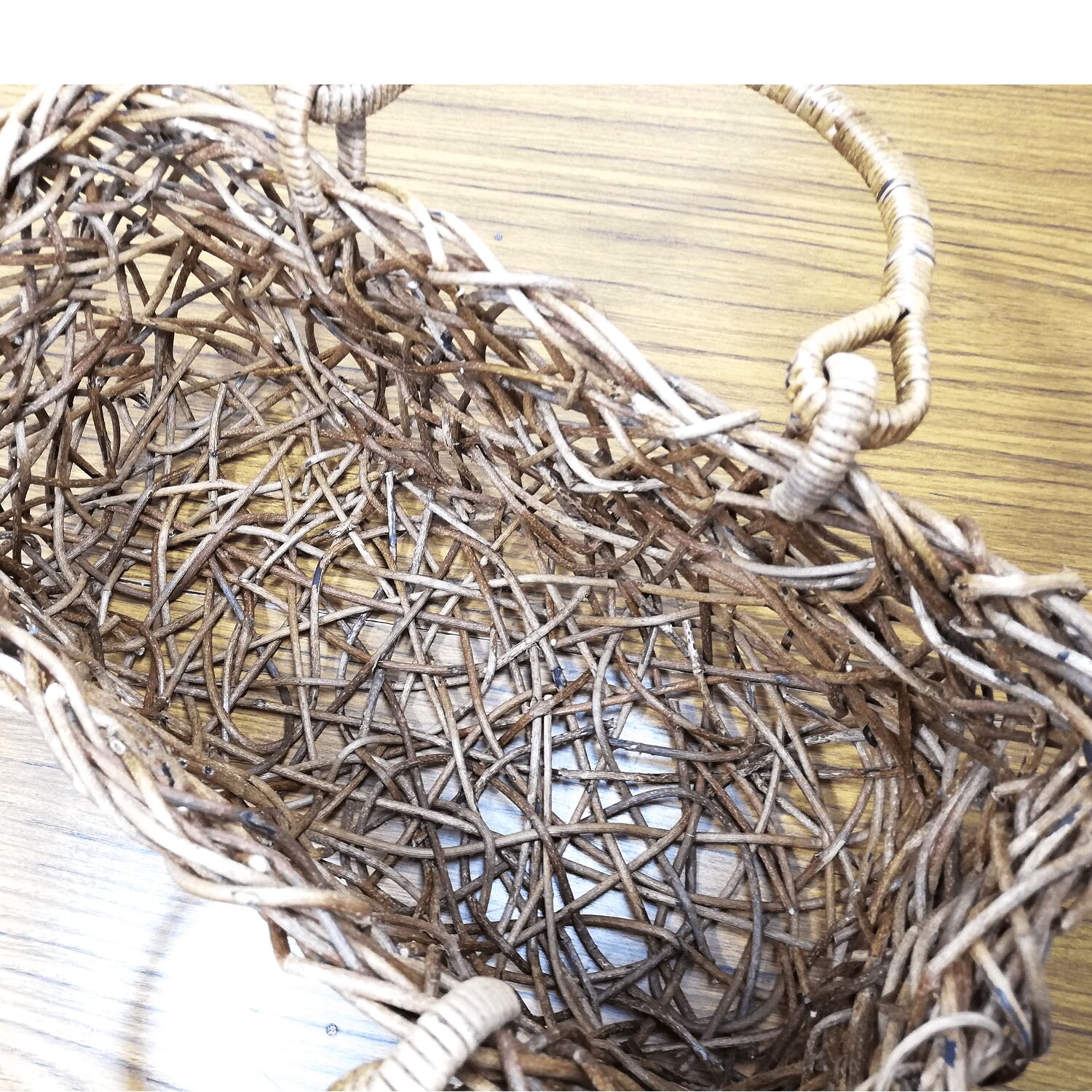 こちらのかごは、通常のあけびかごで用いる「骨組み」がなく、乱れ編みの編み込みだけで形を作っています。