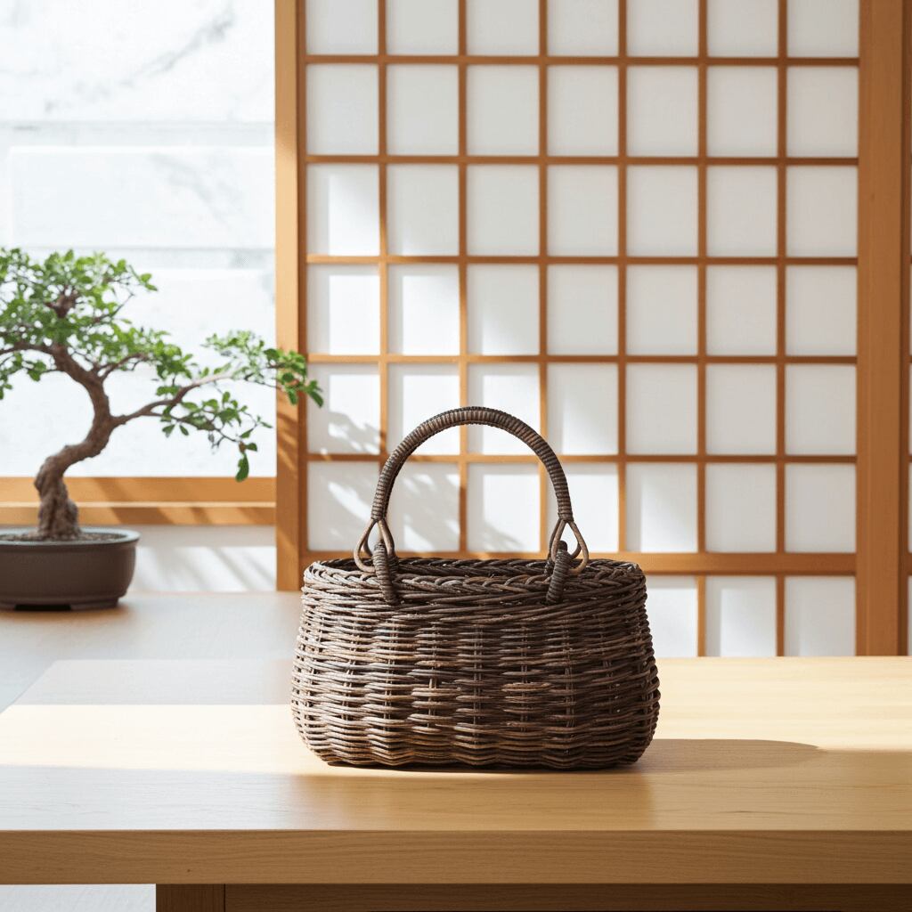 持ち手はミニサイズの篭に合わせた細目の「巻き手」になっており、大きく開閉が可能です。