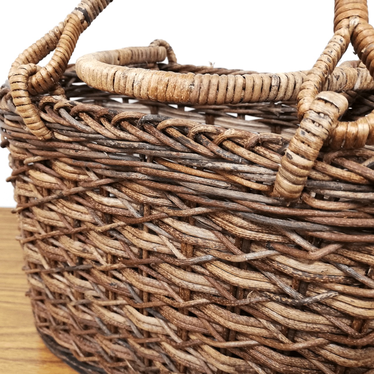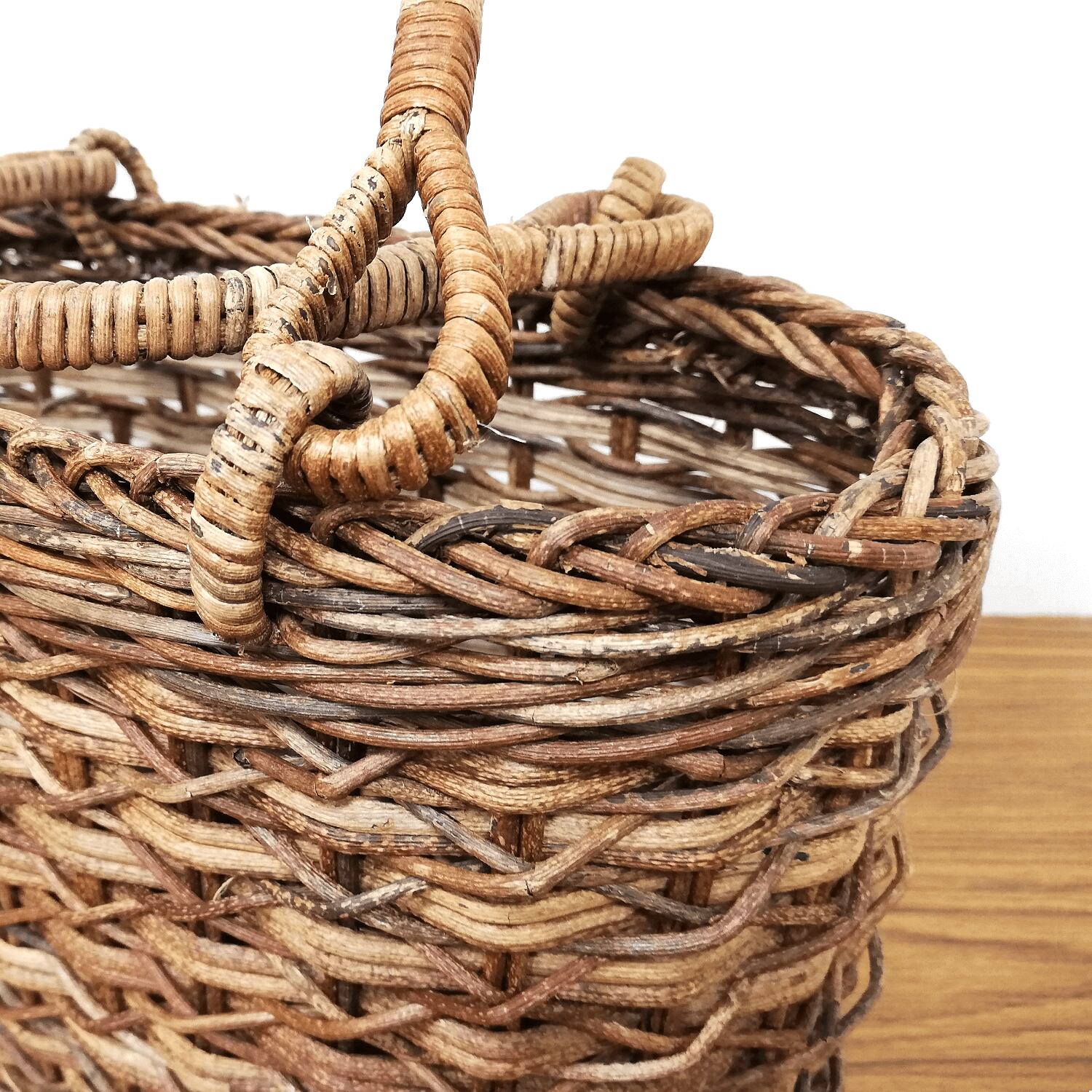 かごの編地は、あけび蔓を縦に半分に割いたものを使用しており、かごの内部が白っぽい仕上がりになるのが特徴です。