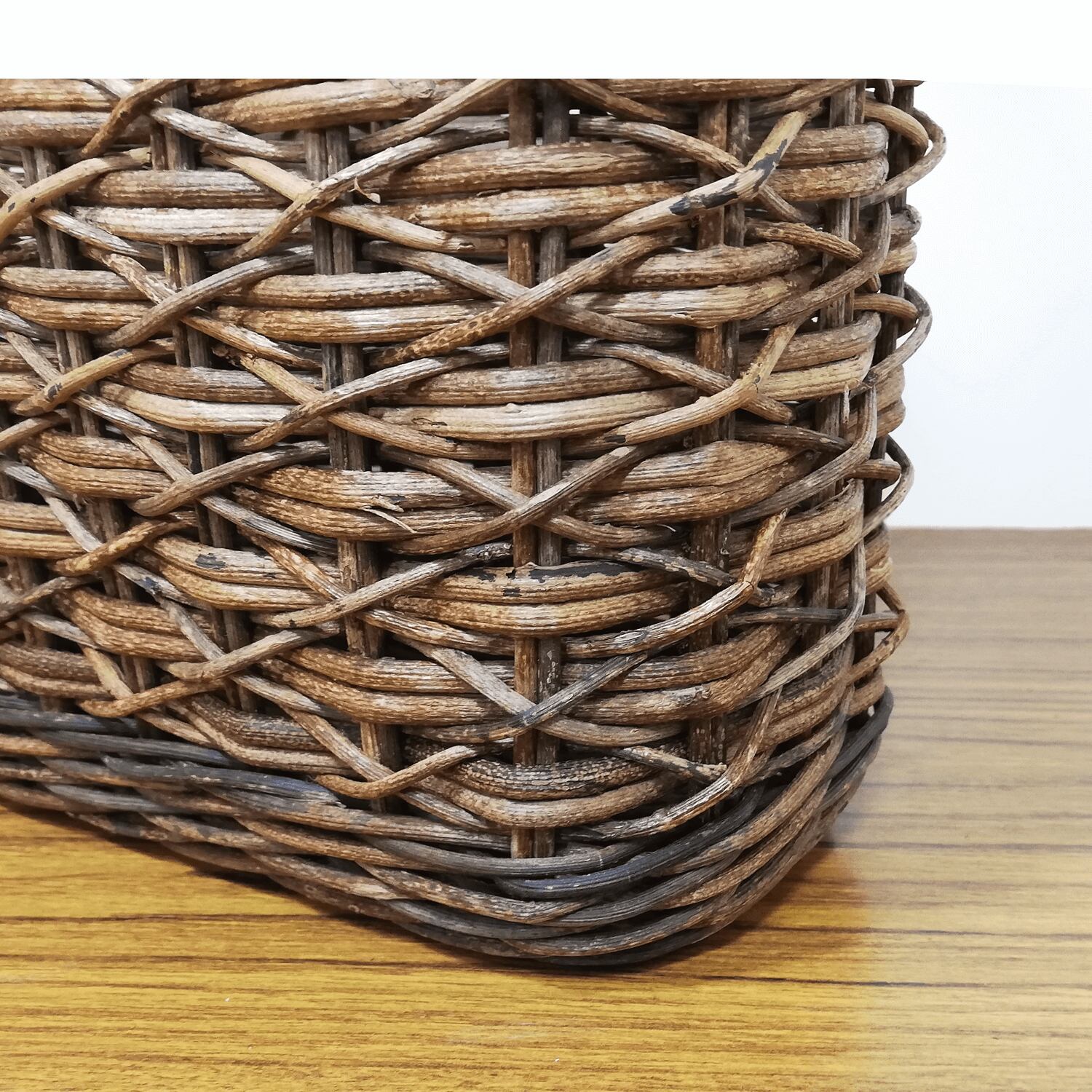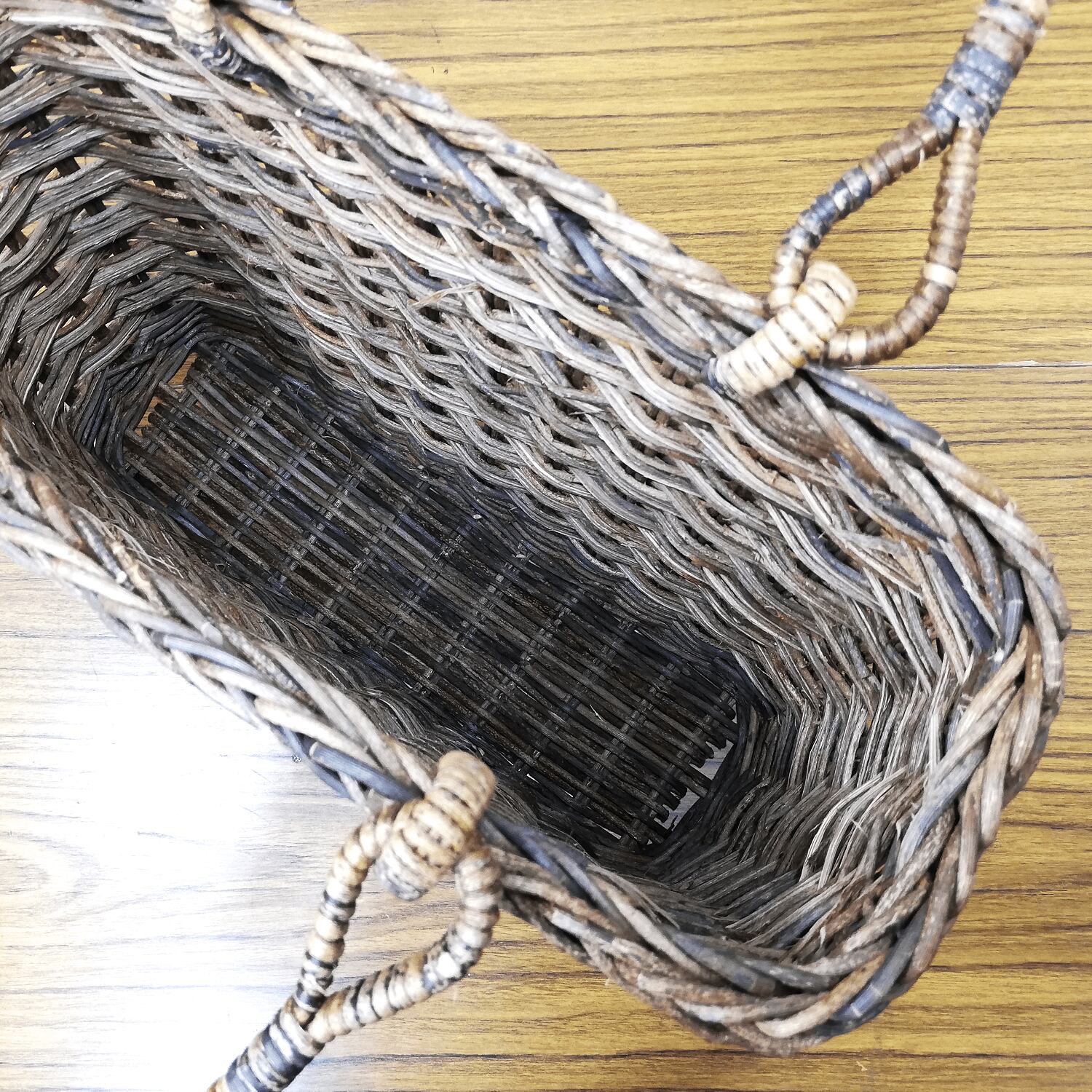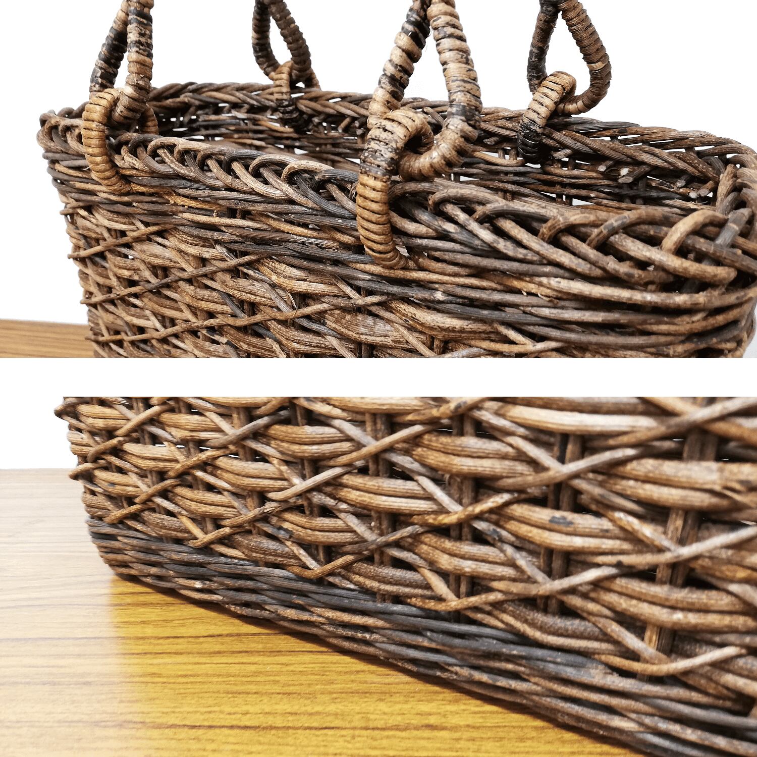あけび蔓の材料不足の影響にて、かごの上部と下部に黒っぽいあけび蔓を多用したこともあり、今回は割引価格での販売となっております。