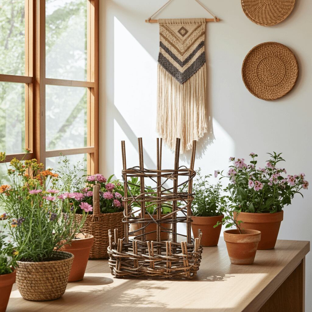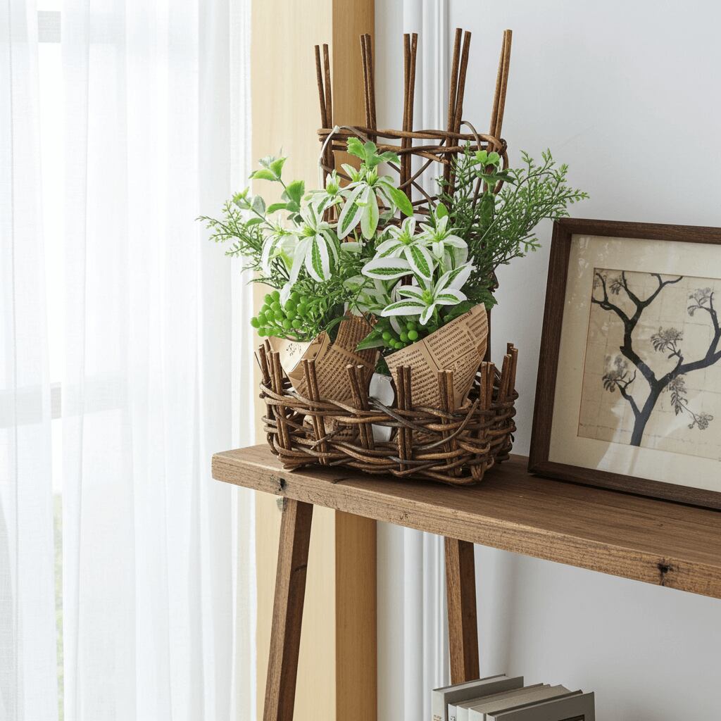 出窓やちょっとしたスペースへ飾れますので場所を取らず、画びょうなどをご使用いただくと、かごを壁に掛けることもできるので、お部屋のいろいろな場所で飾って楽しめます。