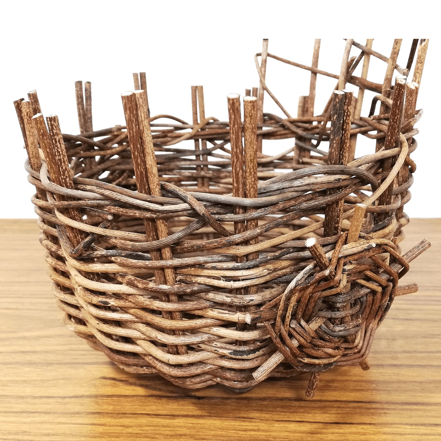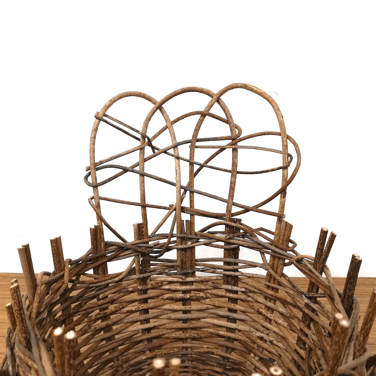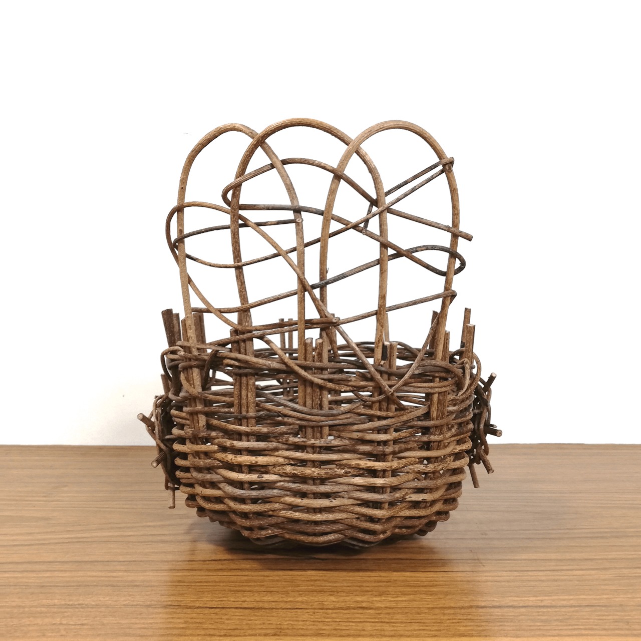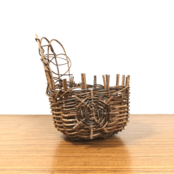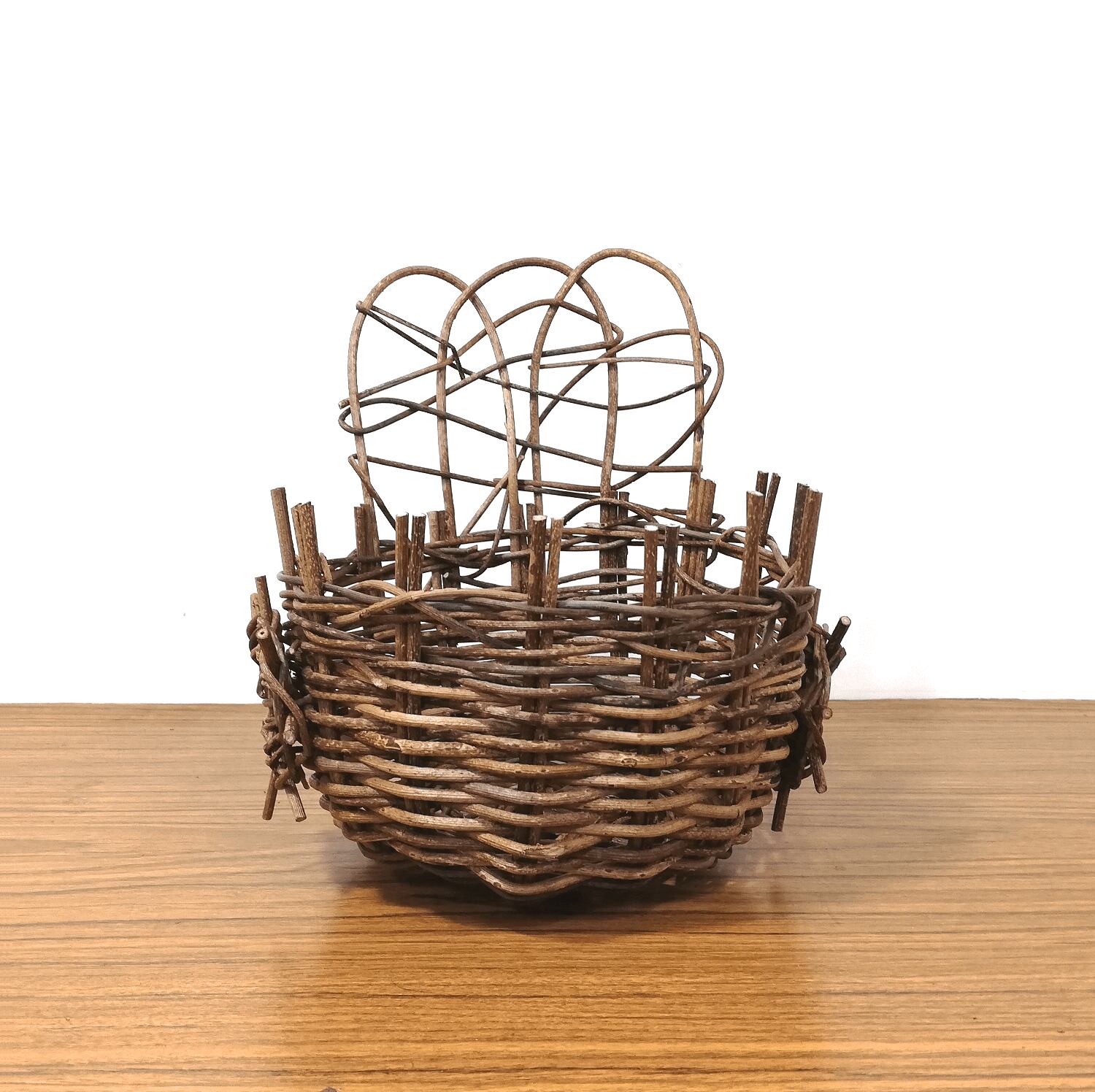 円底のかごを丸く編み上げ、かご上部に乱れ編みをランダムに飾り付け、かごの両側面には、車状の装飾がさりげなく付けてあり、あけびかごにはない手の込んだフラワースタンドに仕上がっています。