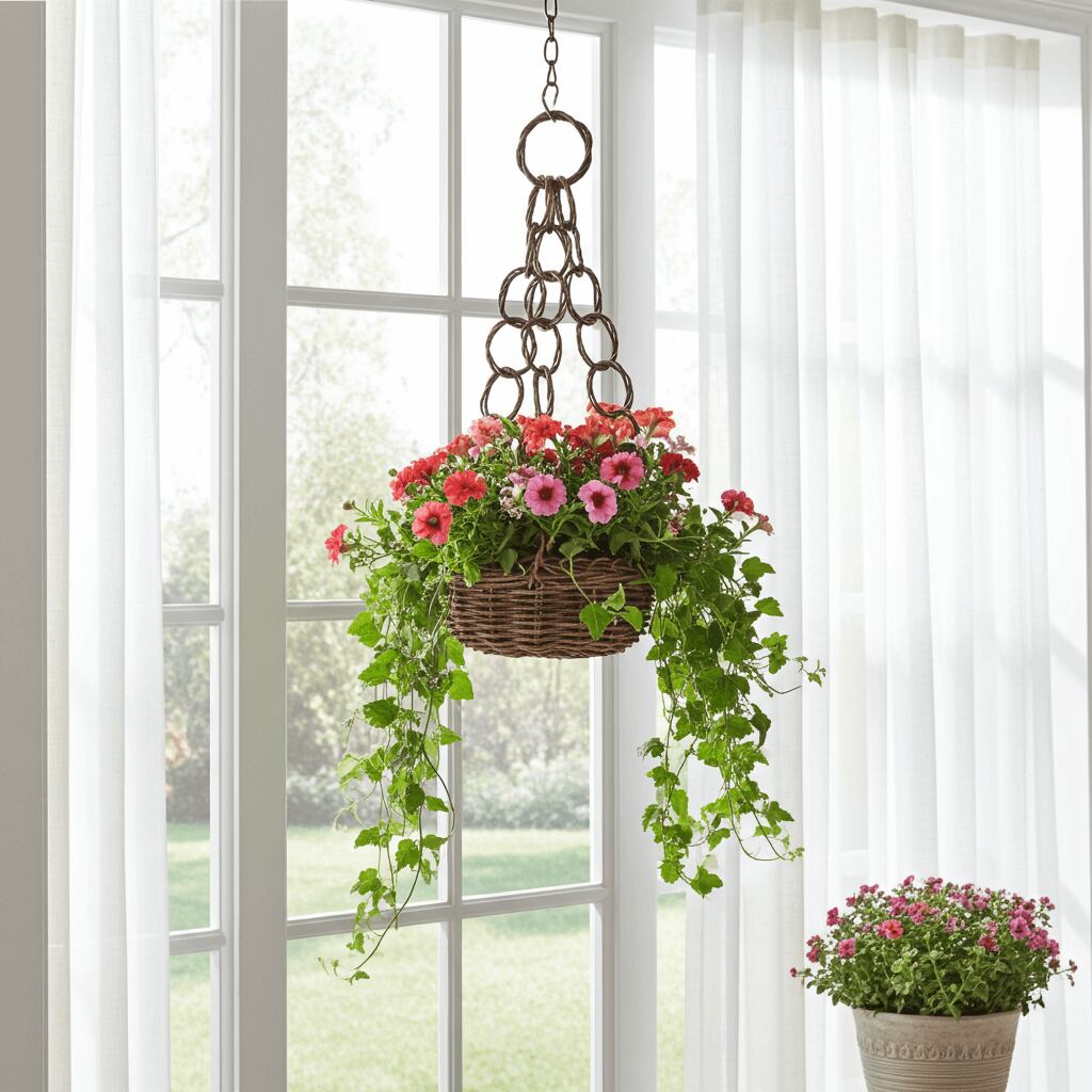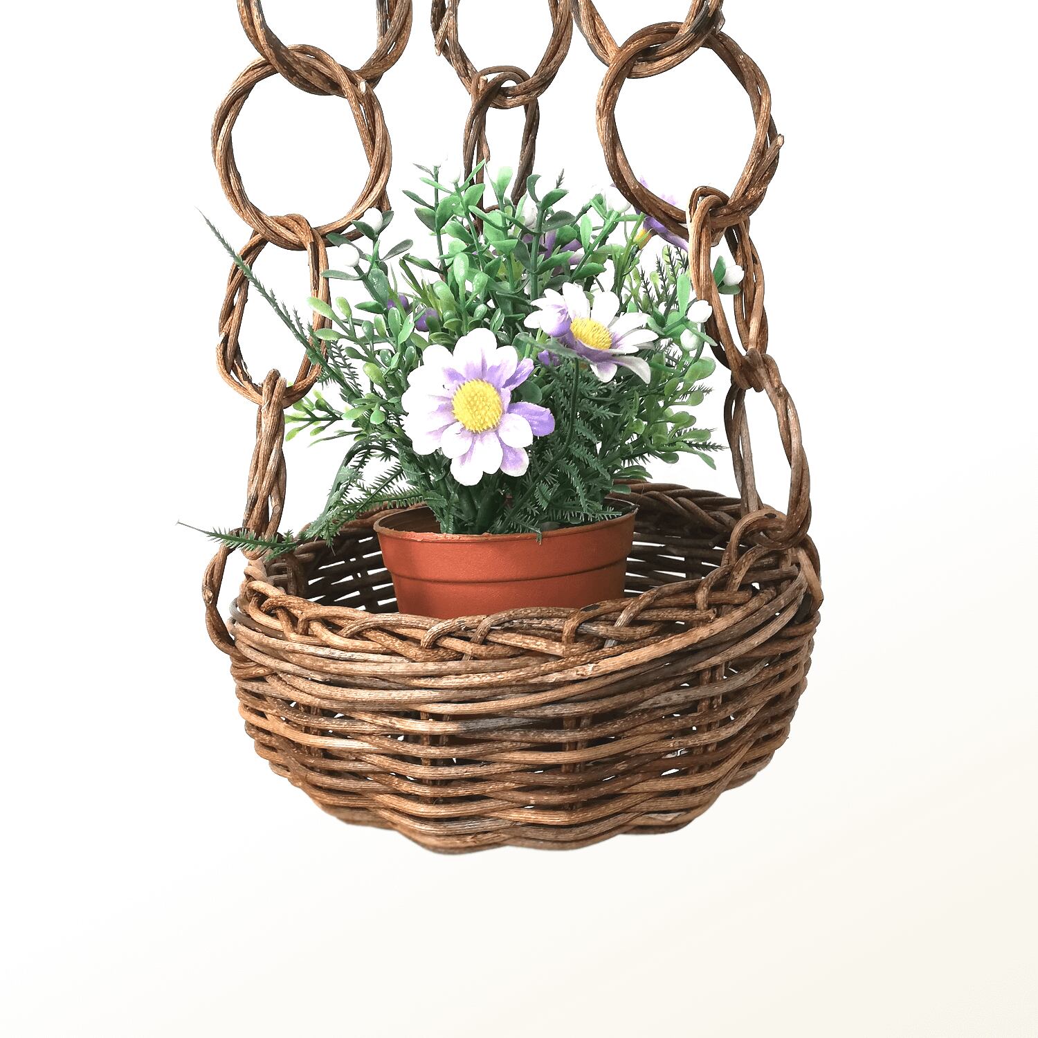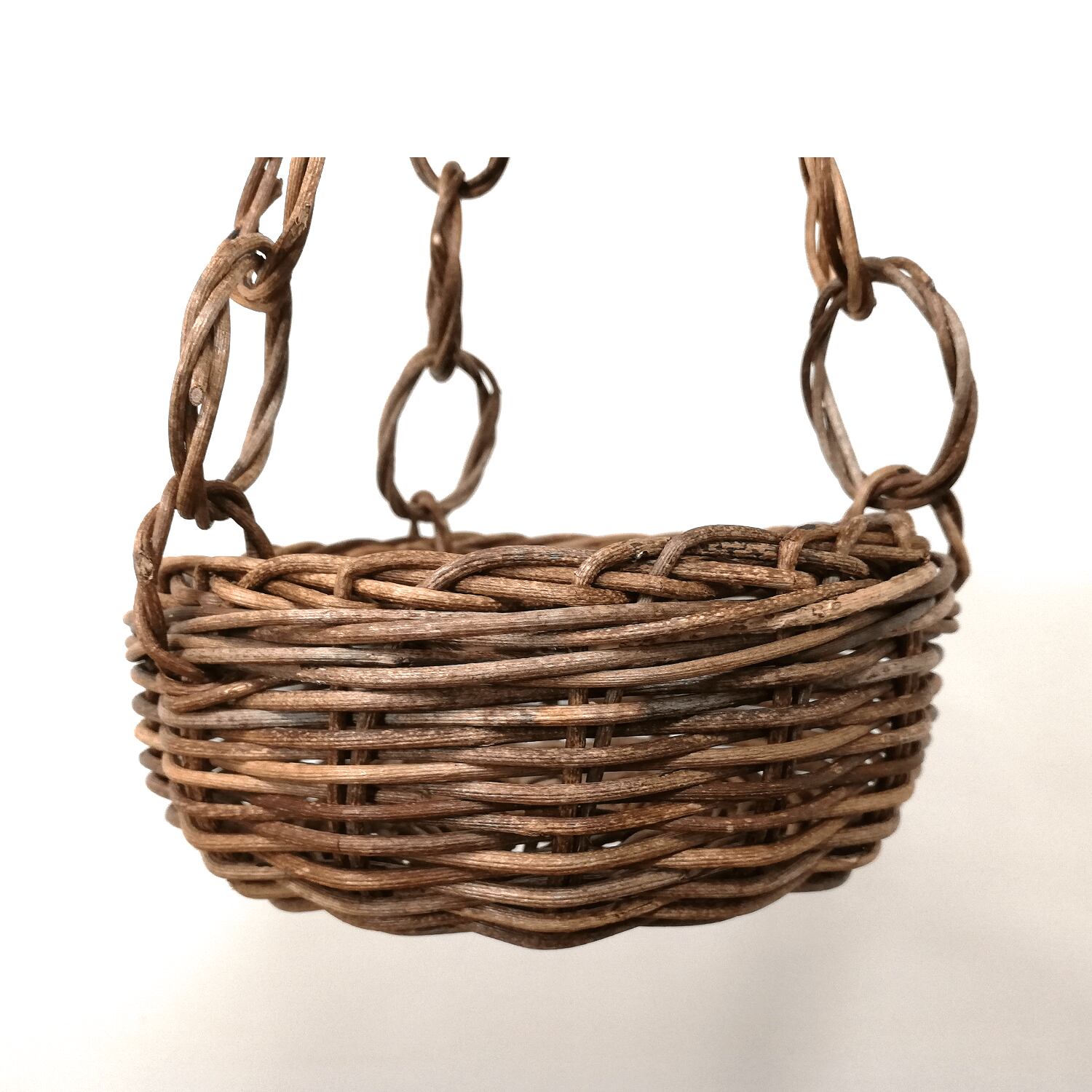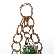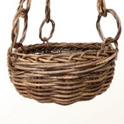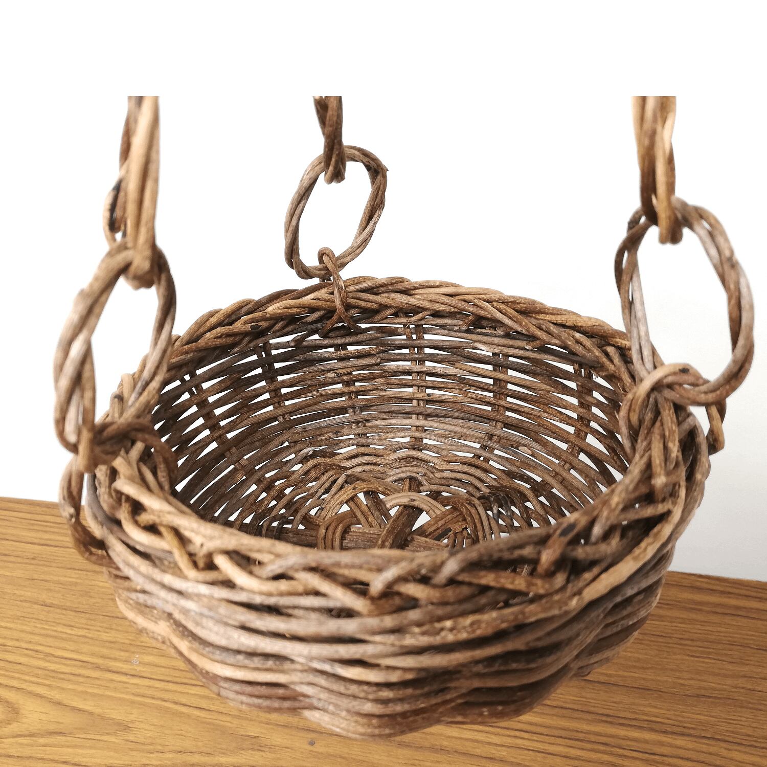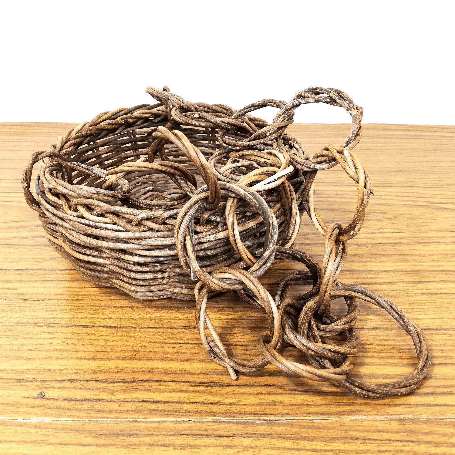 シンプルな並編みのミニバスケットにあけび蔓のリングを連ねた鎖を3か所に取り付けて、壁などに吊るせるように仕上げています。