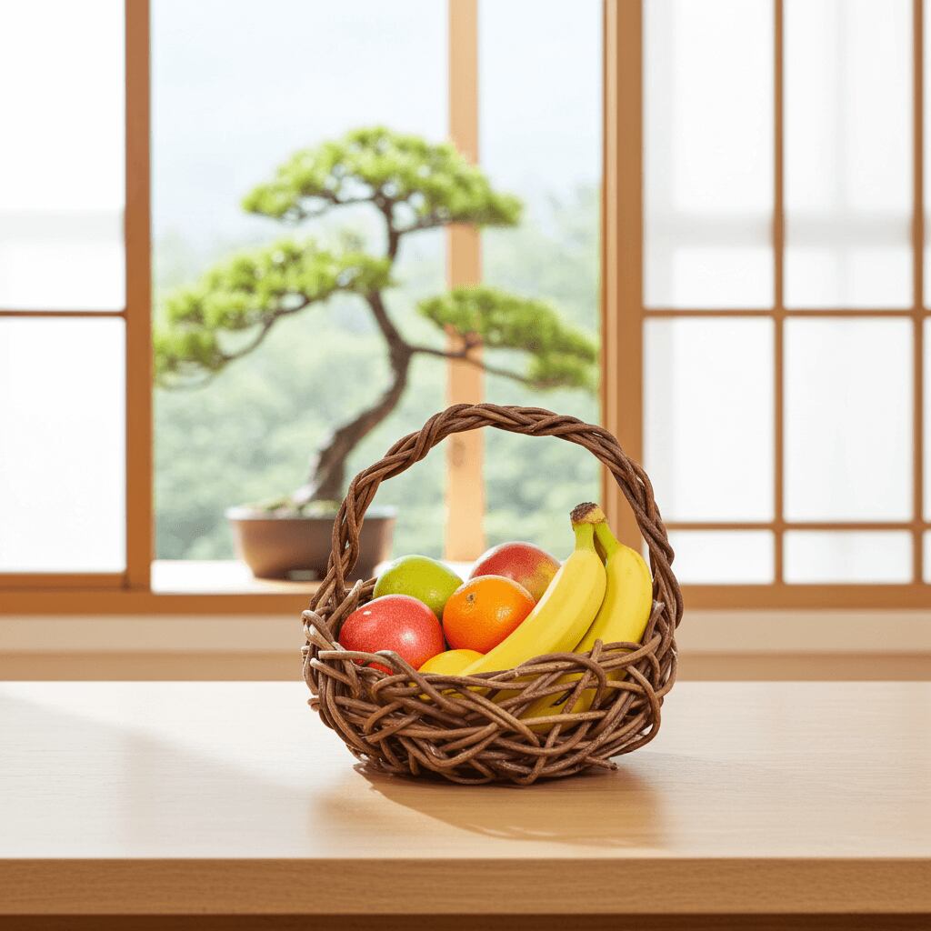太いあけび蔓を乱れ編みで丁寧に通しながら丸く深さをつけ、取手を付けたあけびのミニバスケットです。