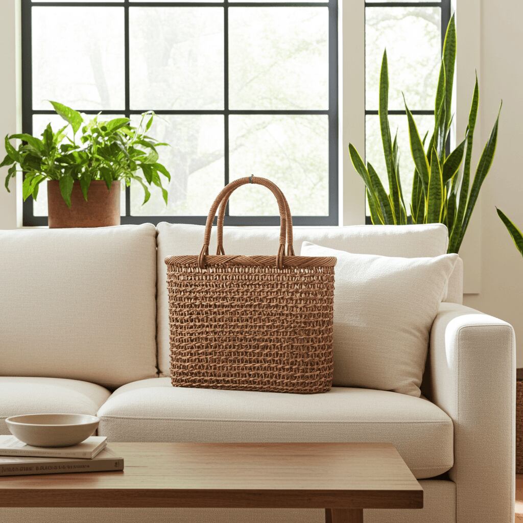 薄型のかごバッグの良さは、お財布や携帯電話、お化粧道具など一通りの持ち物がしっかり収まる実用性を保ちながら、よりスタイリッシュにお使い頂ける点です。