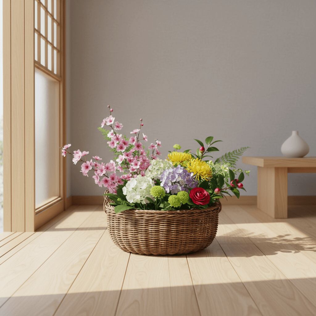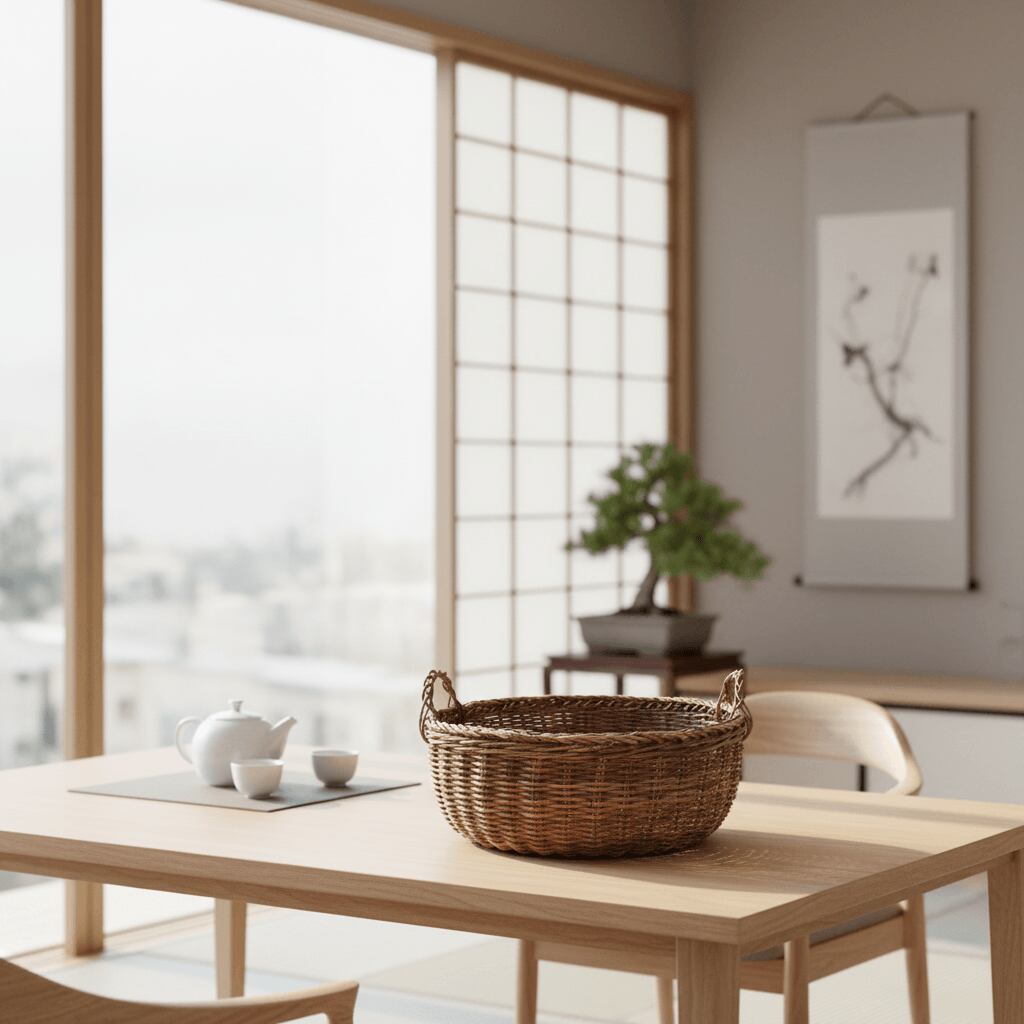 脱衣かごなどにも使える、フリーハンドで仕上げた円形のあけびのバスケットです。